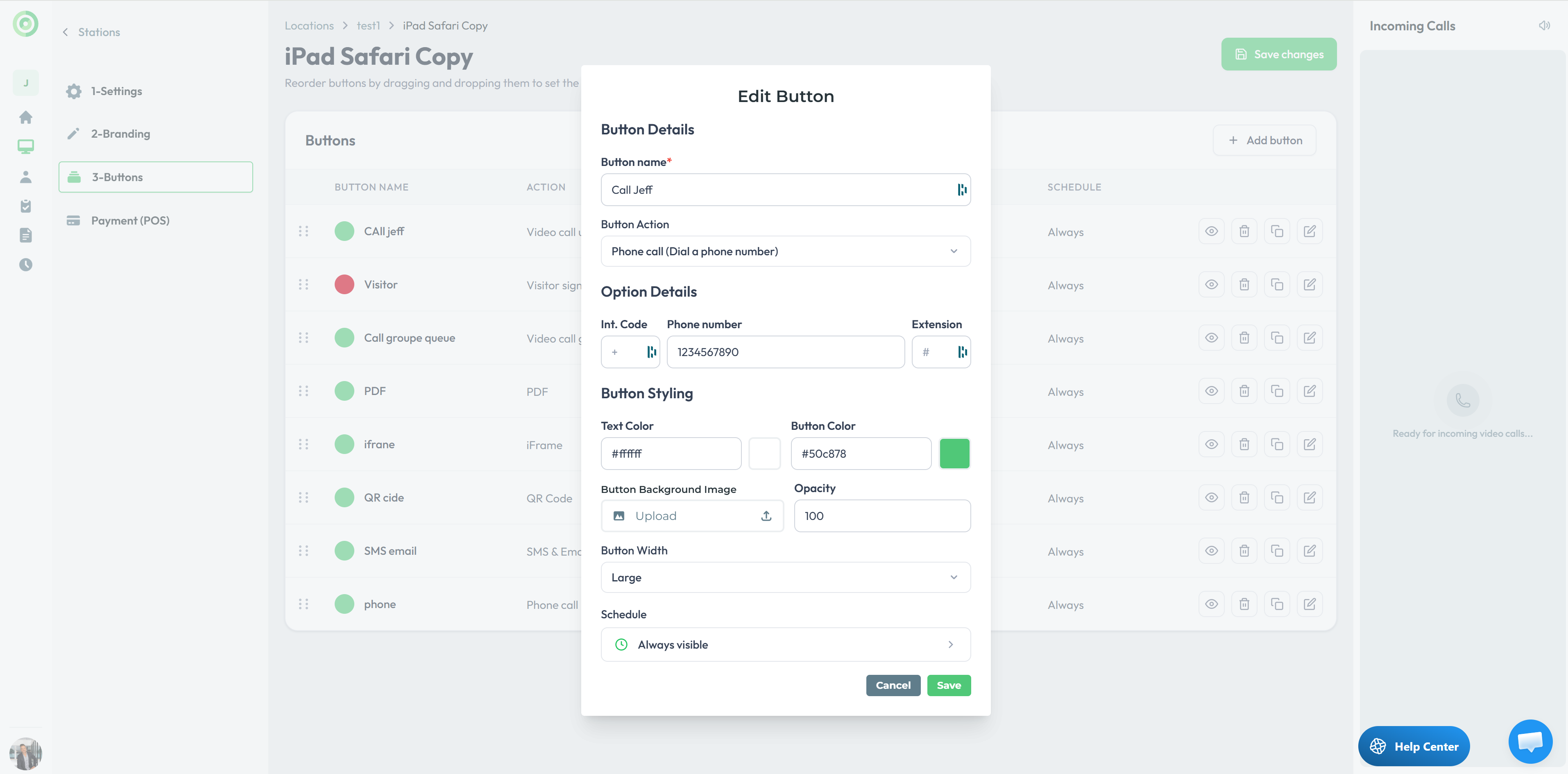 Create a button, give it a name, and select the Phone Call action. Enter the destination phone number. When a visitor clicks the button on the station, the system dials the number immediately.