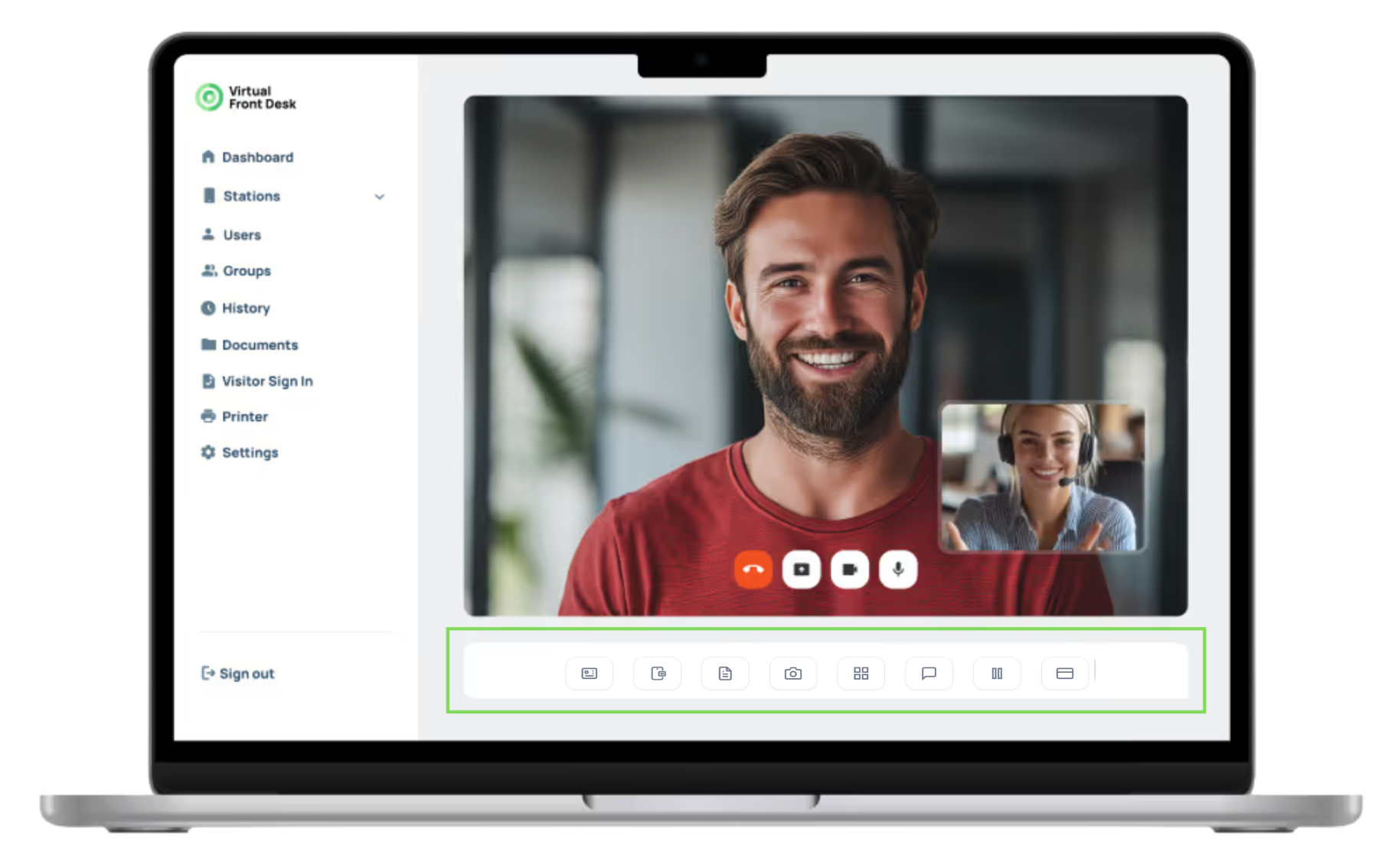 The scanner feature does not require any physical hardware. It uses the visitor’s own device. During a live call, the host can click the "Scanner" button, which displays a QR code on the station screen. The visitor scans this code with their phone, opening a secure browser page that allows them to either take a photo of a document or upload one from their phone's image library. Visitors can upload multiple images. On the host side, a live preview appears to confirm the image quality before submission. All uploaded documents are saved in the call history for future reference.