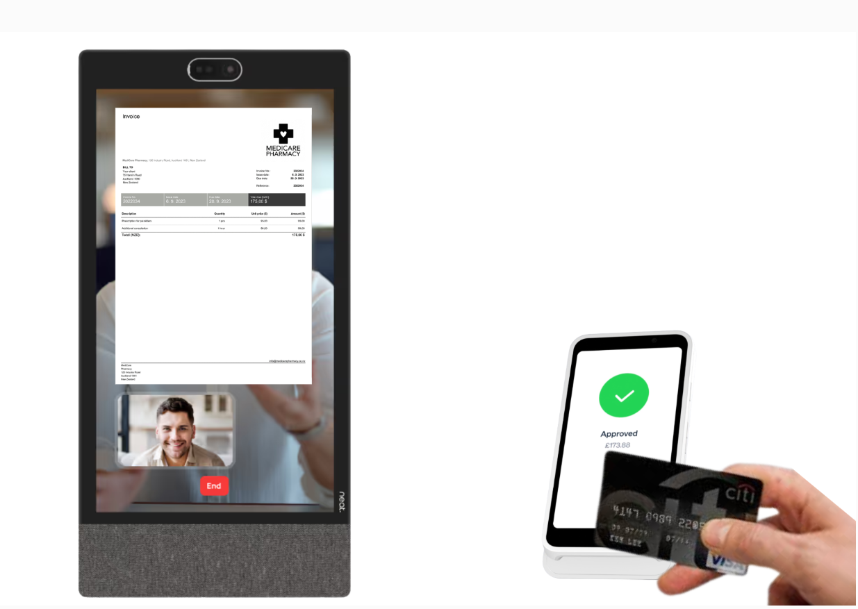 Send an invoice to the station screen for you customer to see and, and a payment request to the Stripe terminal for Credit and debit Cards payments.