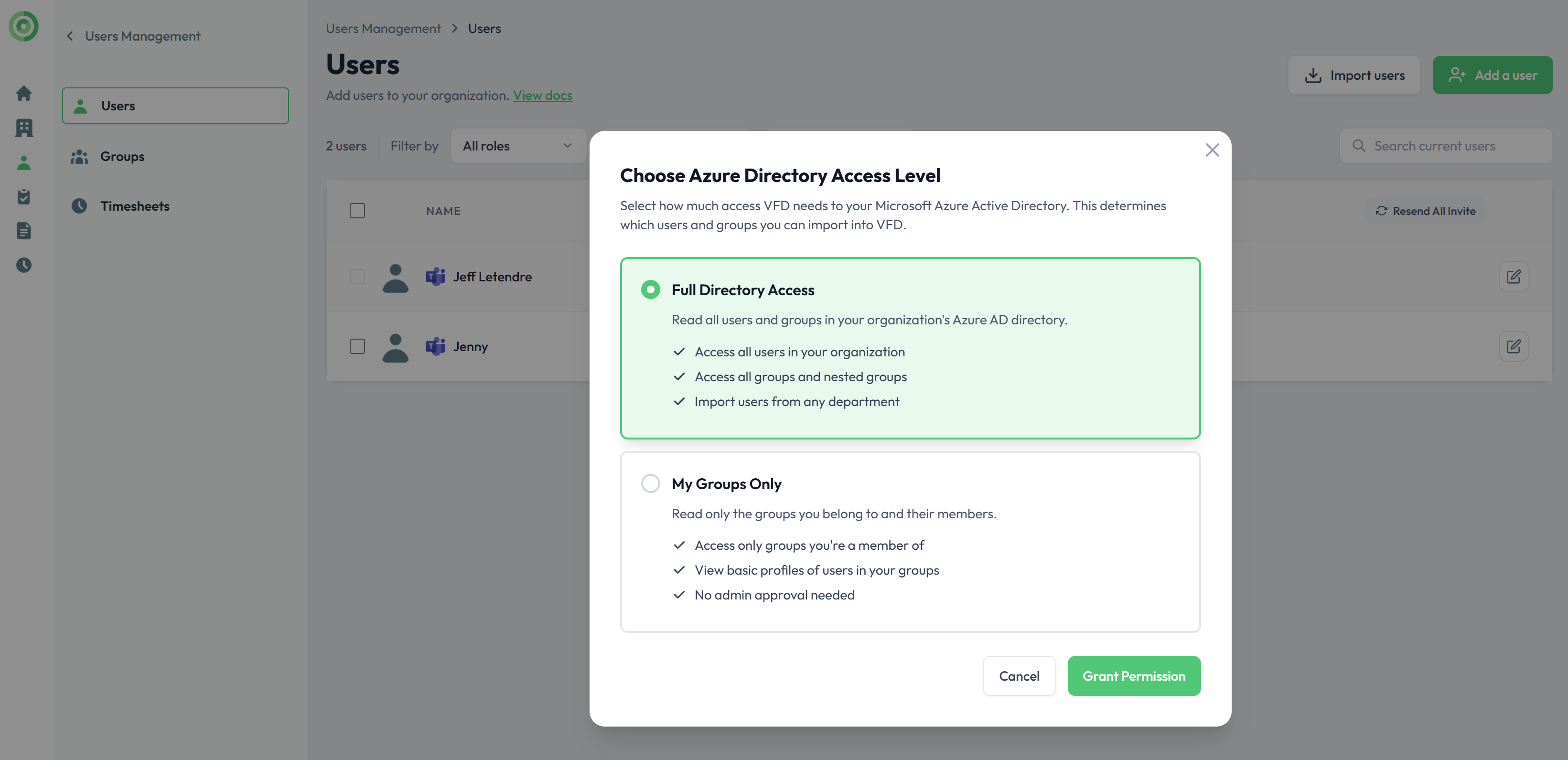 Select how much access VFD needs to your Microsoft Azure Active Directory. This determines which users and groups you can import into VFD. You will need Microsoft permission to provide this access.