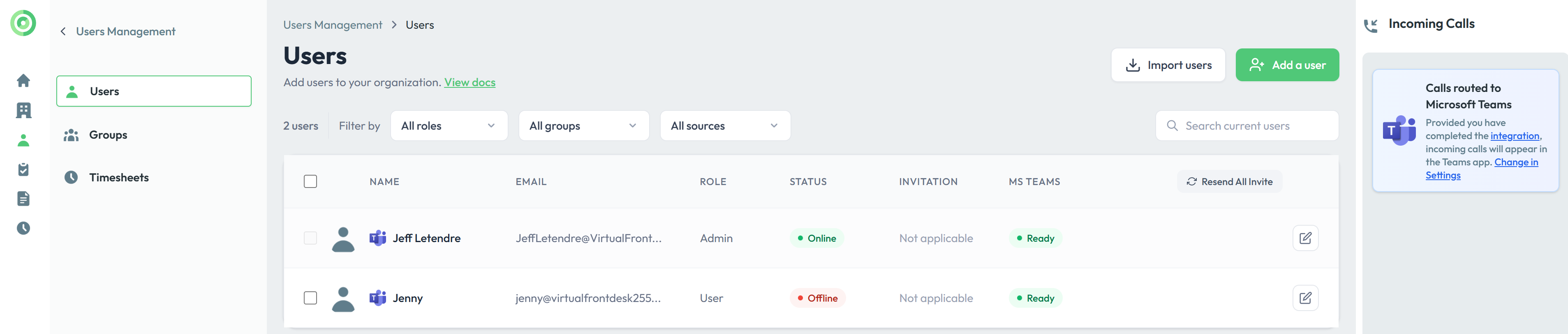 Please note that users imported from Azure do not need to ever log into Virtual Front Desk. If they are Enterprise Voice enabled and have a Microsoft Teams Phone Standard license, their integration is complete. The "Pending" status means the user is yet to log in at least once into their Virtual Front Desk dashboard using the same MS SSO log in. They can stay in pending status and still use MS Teams.