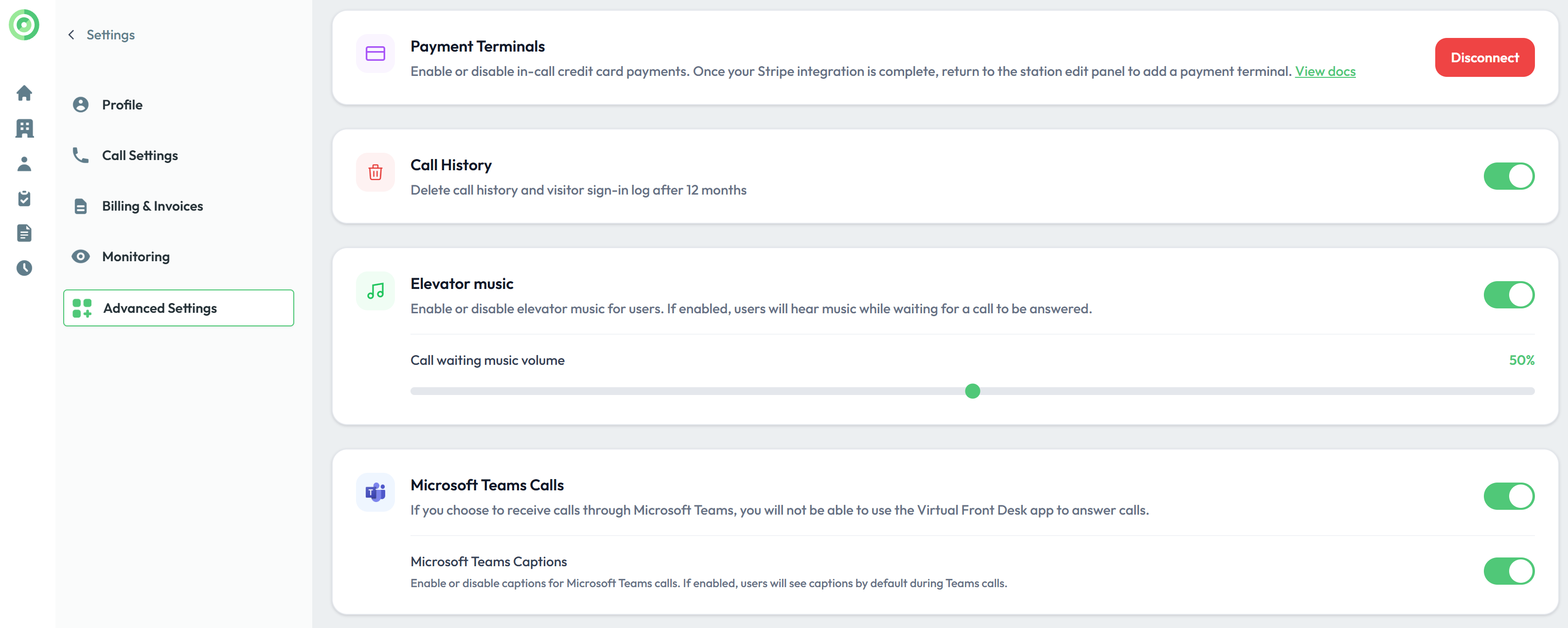 Under settings, advance settings, make sure the MS Teams Calling option is switched on. While an account can use VFD and the Teams app simultaneously, each individual user must choose between receiving video call notifications in MS Teams or in the VFD dashboard.