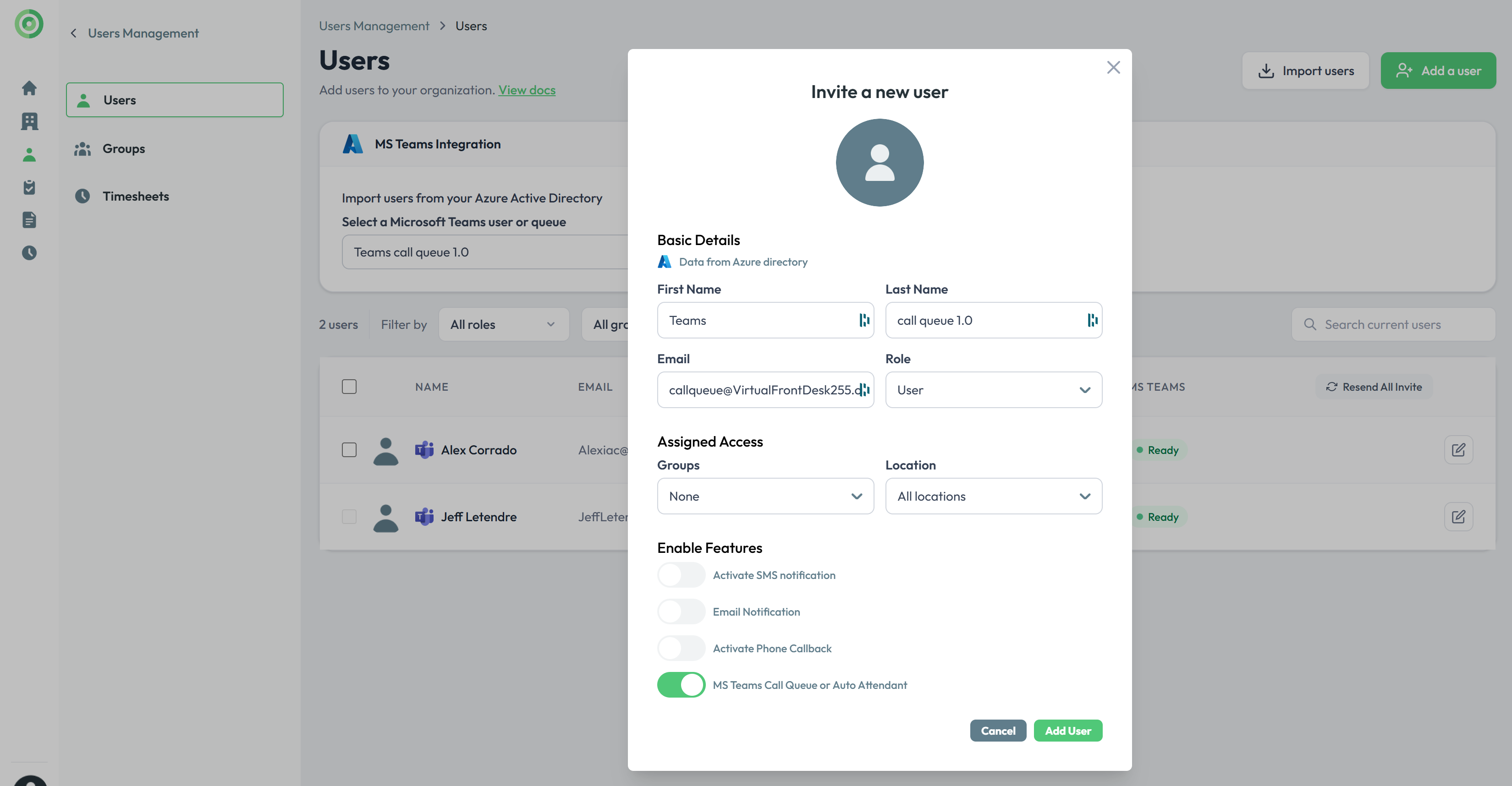 Adding users by email is intended for the Virtual Front Desk web app and does not apply to Microsoft Teams users. To add Microsoft Teams users, click Enable Azure Integration.