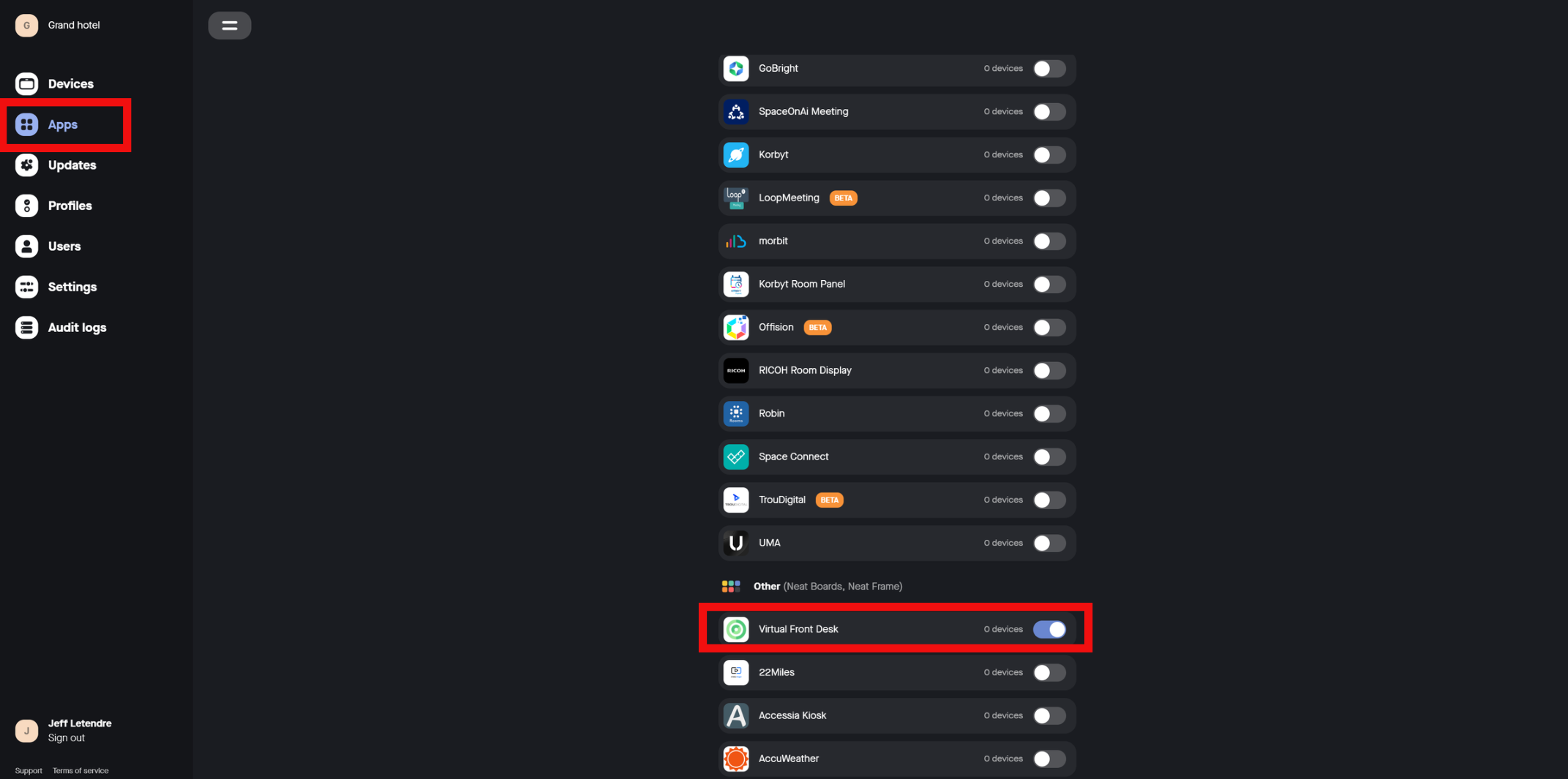 - Go to the Apps menu and toggle on Virtual Front Desk.