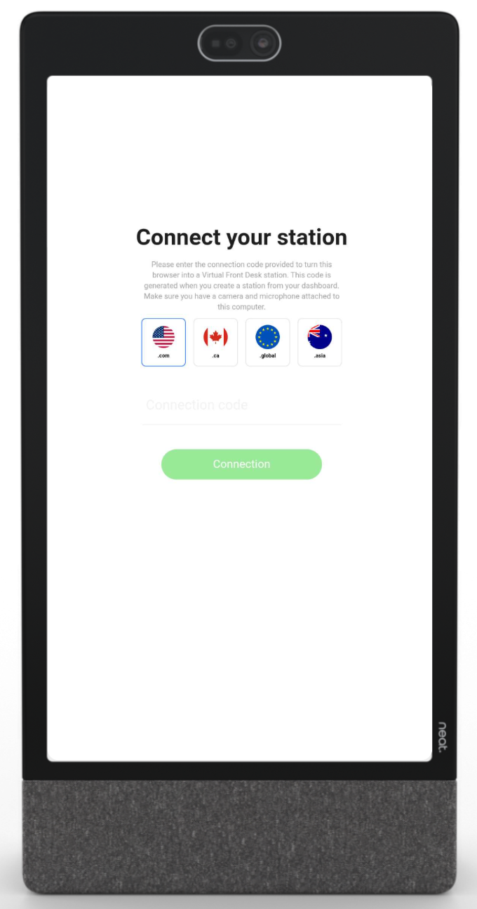 Virtual Front Desk will load asking for a station's connection code. You can find in your Virtual Front Desk's dashboard. (Select the same region as your Virtual Front desk account.) app.virtualfrontdesk.com. Learn how to create your Virtual Front Desk station here.