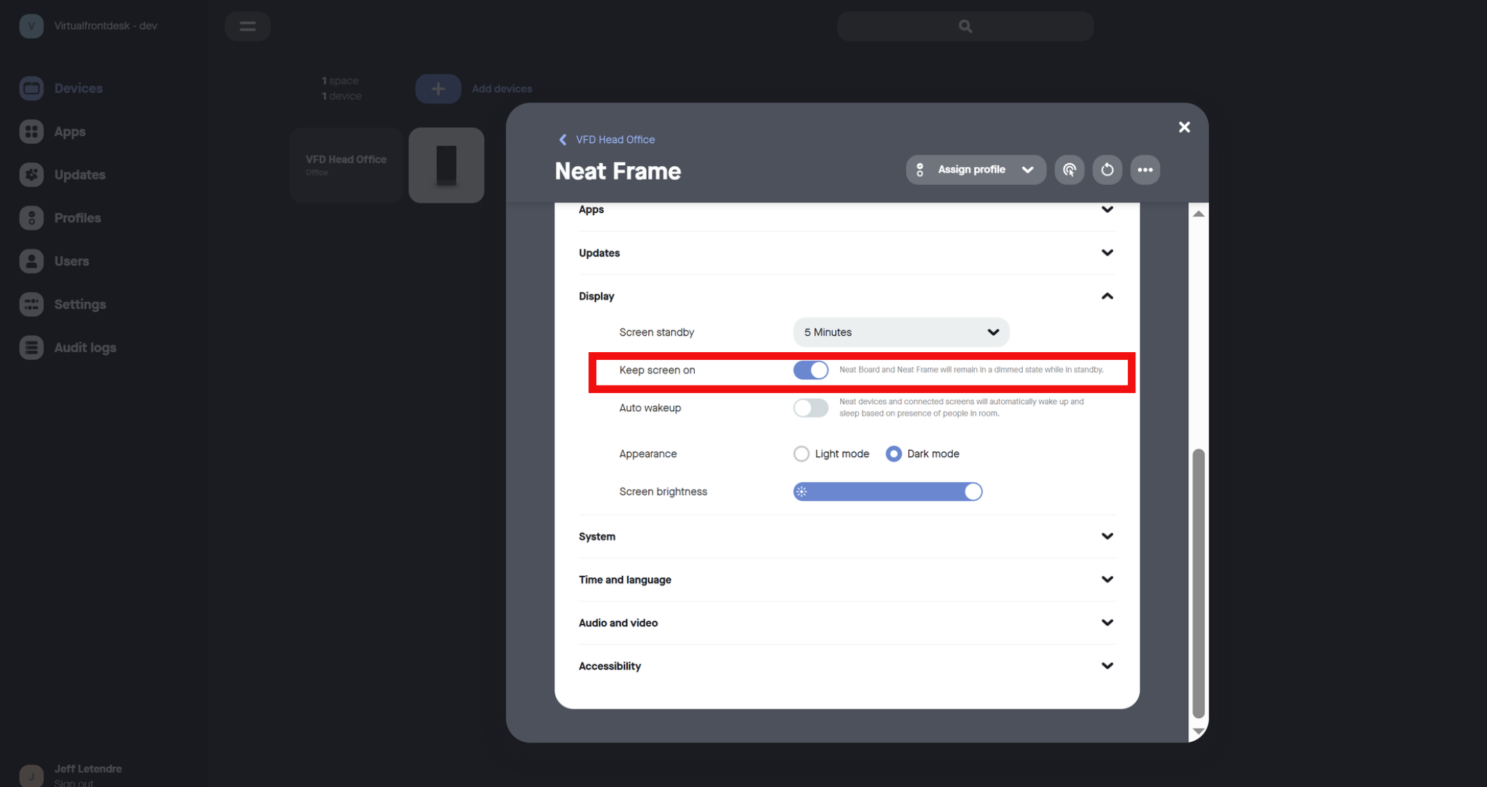 For the final steps, go to your Pulse account, click the device picture and under Apps, toggle the Kiosk mode to remove the settings menu from the screen. Next, go to Display and toggle Keep screen on. You are all set and ready to use Virtual Front Desk with your Frame!