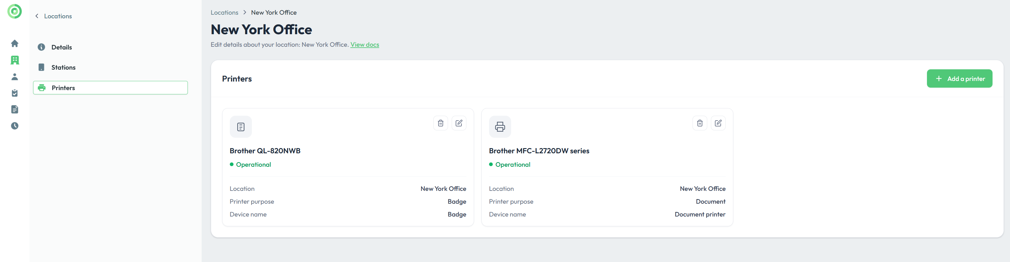 Badge and document printers are configured at the location level, since multiple stations can share the same printer. If you prefer to have one printer per station, create a separate location for each station.