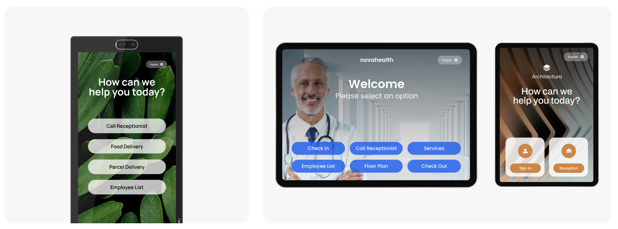 Starts the selected visitor sign in form. Select multiple Sign in forms to create a submenu. (Create your Sign in forms from the Visitor sign in tab.) Visitors can pre register and express sign in at the station with a QR code or 4 digit code.