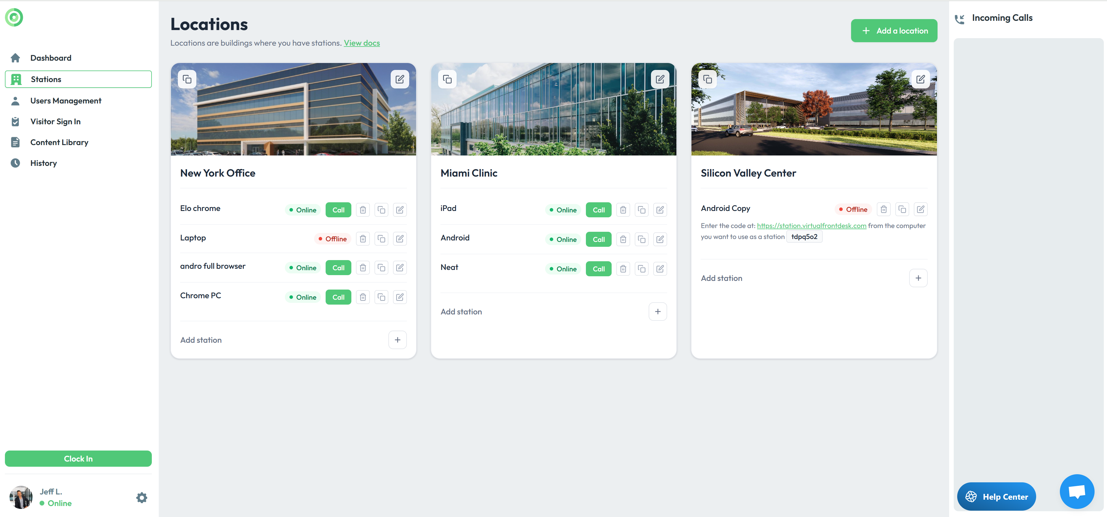 Locations are physical addresses where you can manage one or multiple stations. Start by creating a location, and then add stations to it. The pictures and addresses of your locations are for internal use. Virtual Front Desk is ideal for efficiently managing multiple locations under a single account.