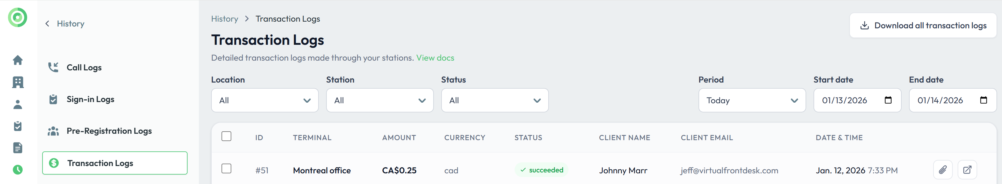 After the transaction is complete, a copy of the invoice and receipt will be emailed to the customer. For easy reference, all transactions are saved in the Virtual Front Desk Dashboard under the History tab > Transaction Logs.