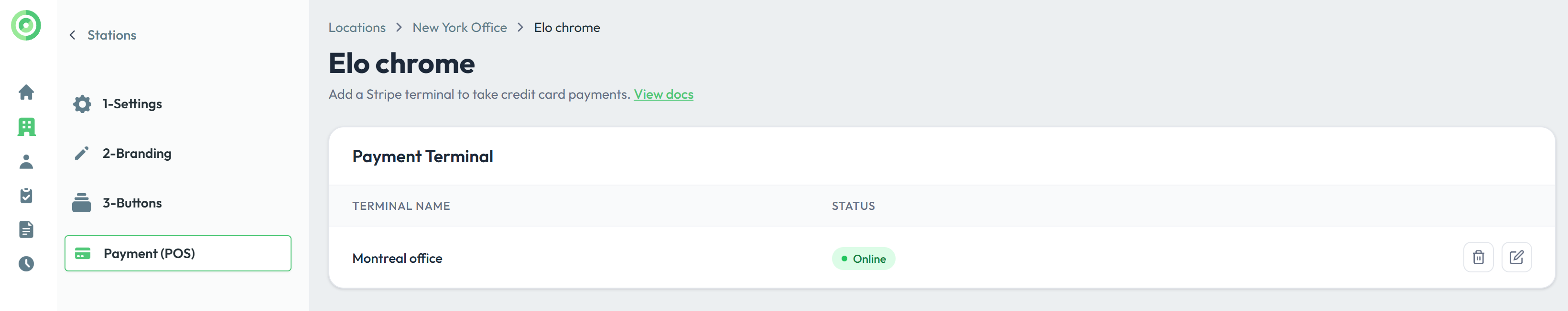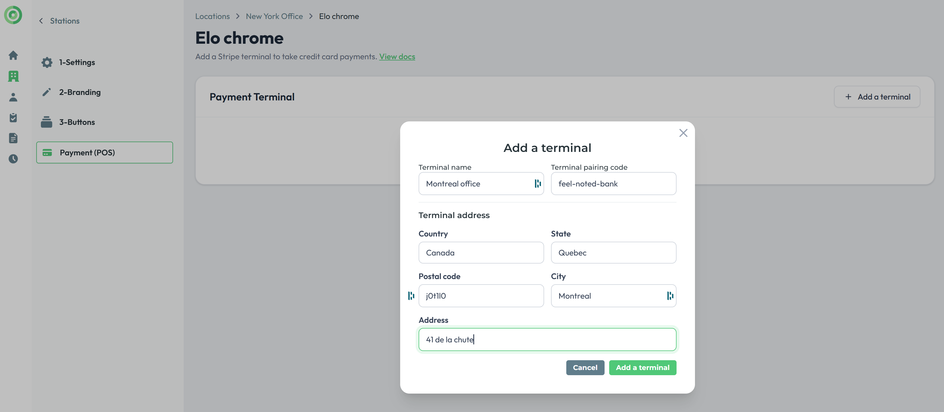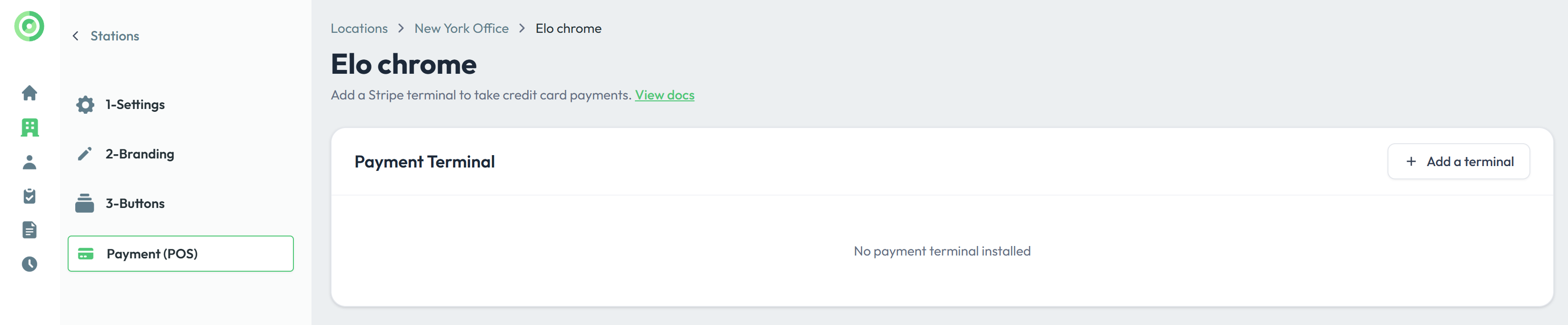 Once your Stripe account connected, go to the station's edit panel you would like to add the terminal to. Click add terminal.