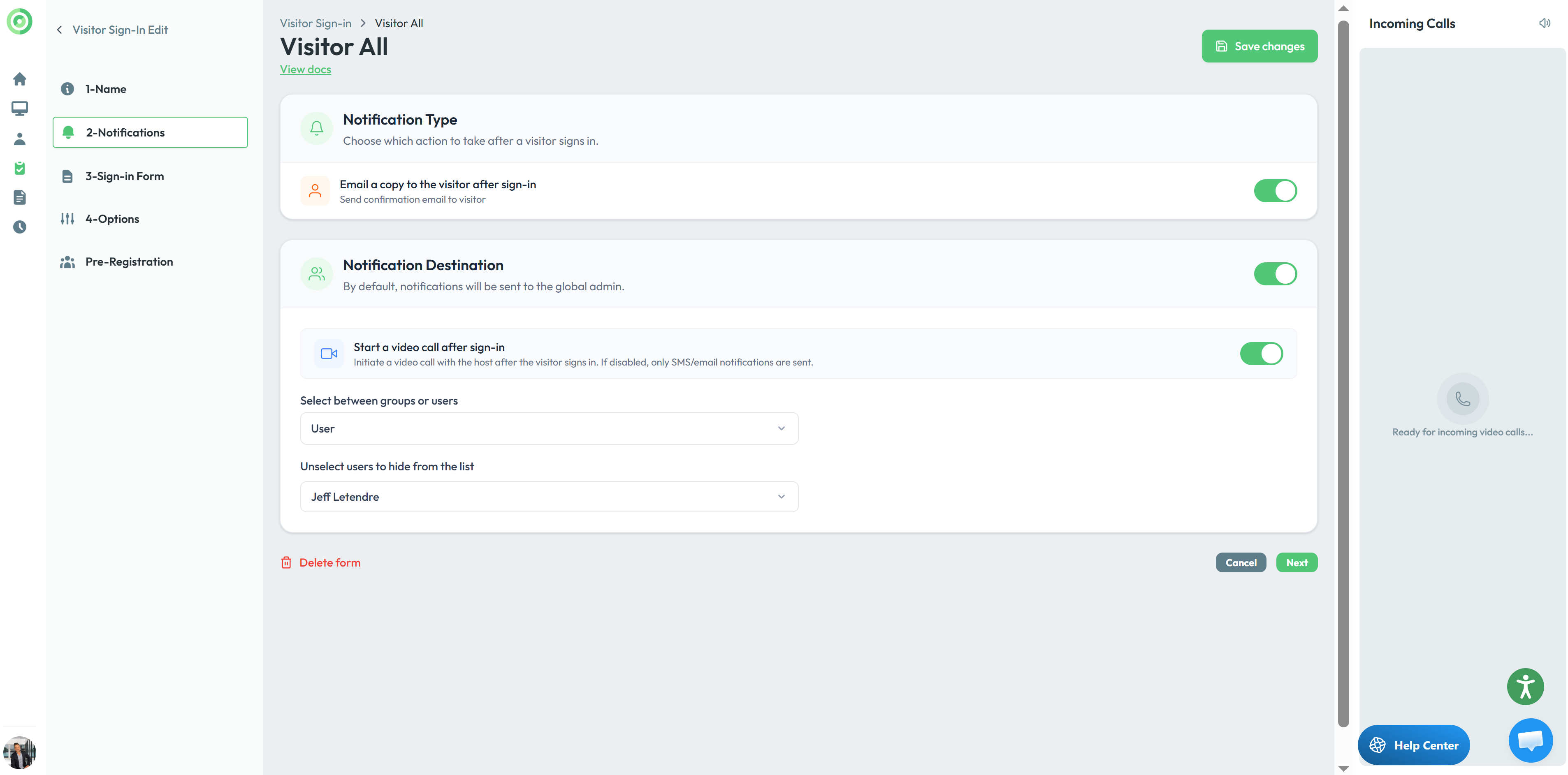 In this section, you can choose whether to send the visitor a copy of the sign-in form by email. You can also select who should be notified after the visitor signs in, or allow the visitor to choose the person they have an appointment with if multiple users are listed. Whether the notifications is sent by SMS, email, phone call of video, is determined by the user's own preferences. Additionally, you can disable the video call option.